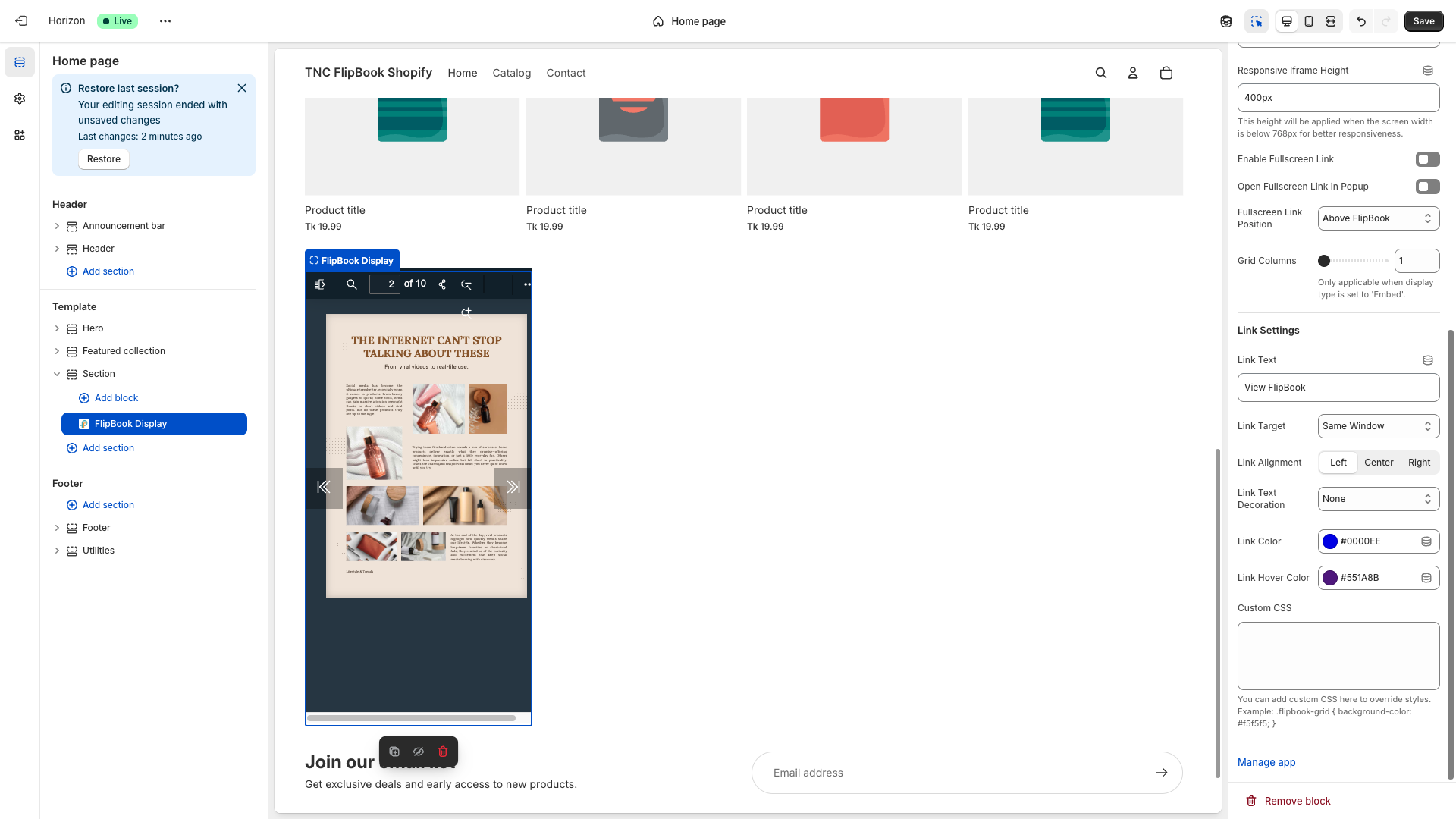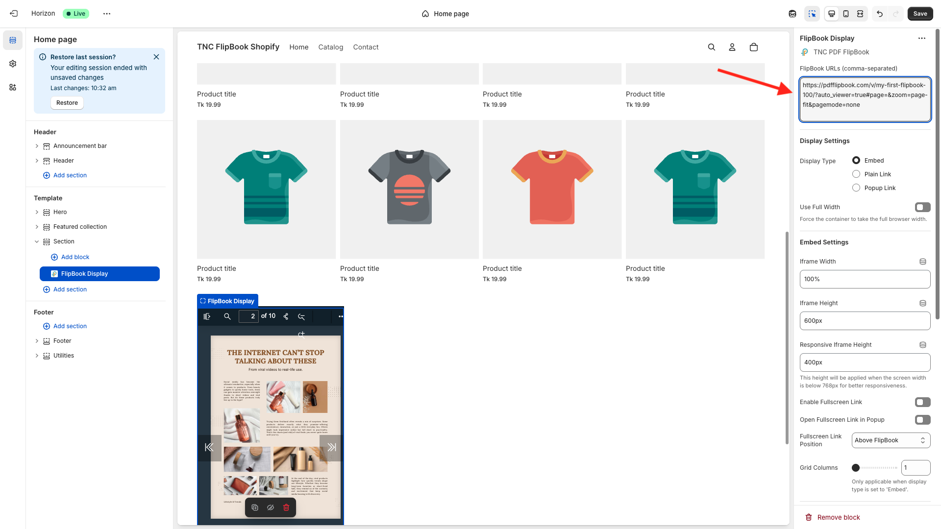 Embedding FlipBook on shopify store using "FlipBook Display" App Block