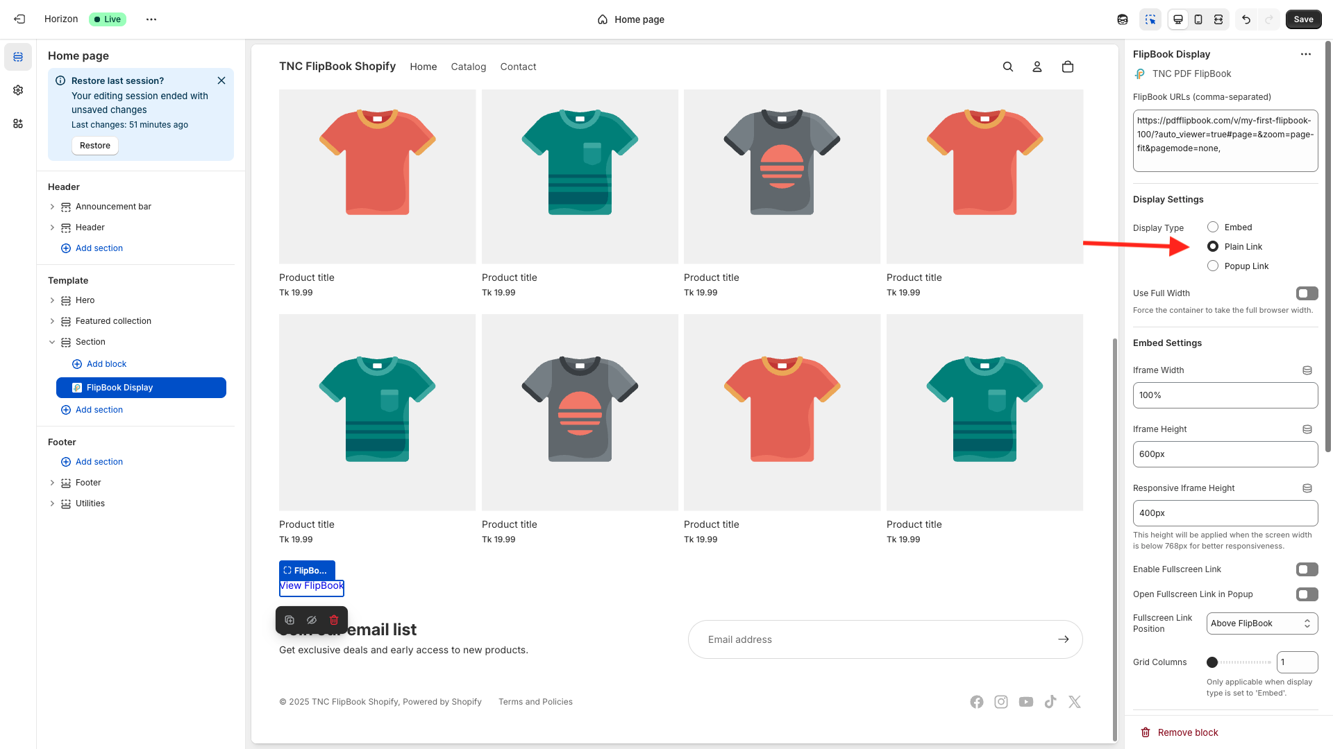 Linking to FlipBook on shopify store using "FlipBook Display" App Block